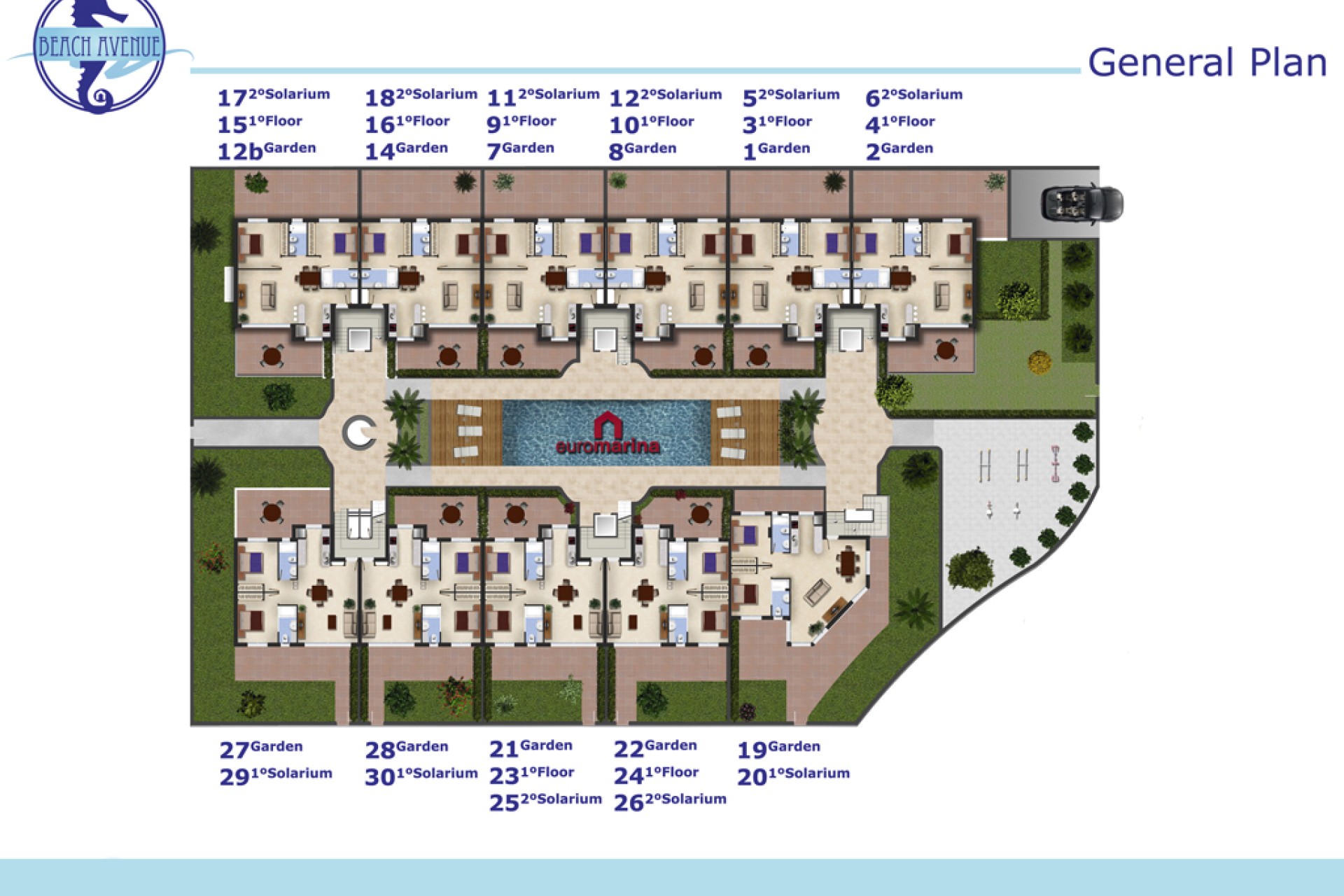 Los apartamentos de la planta baja tienen un jardín privado, los de planta alta tienen una terraza cubierta. Además los apartamentos tipo ático tienen terraza cubierta y una terraza privada en la azotea. Los apartamentos también tienen acceso a una zona comunitaria con piscina y jardines comunitarios. El complejo de apartamentos también cuenta con un aparcamiento subterráneo.