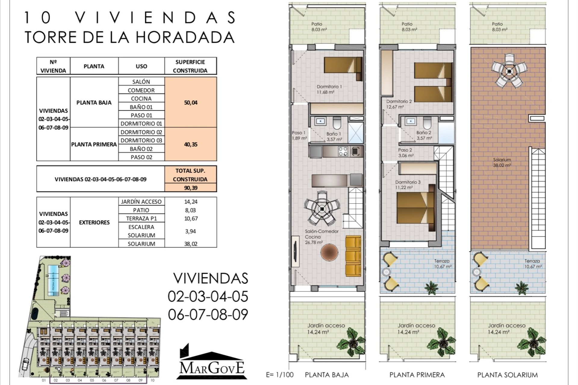 Las viviendas tienen una superficie habitable de 90 m2 y se distribuyen en dos plantas. Se componen de un total de 3 habitaciones dobles y 2 baños. En la planta baja puede encontrar un dormitorio, un baño, una cocina abierta y un salon. Desde el salon hay acceso directo al jardín y desde el dormitorio tiene acceso a un patio. En el primer piso puedes encontrar dos dormitorios y un baño. Desde una de las habitaciones tiene acceso directo a una terraza.