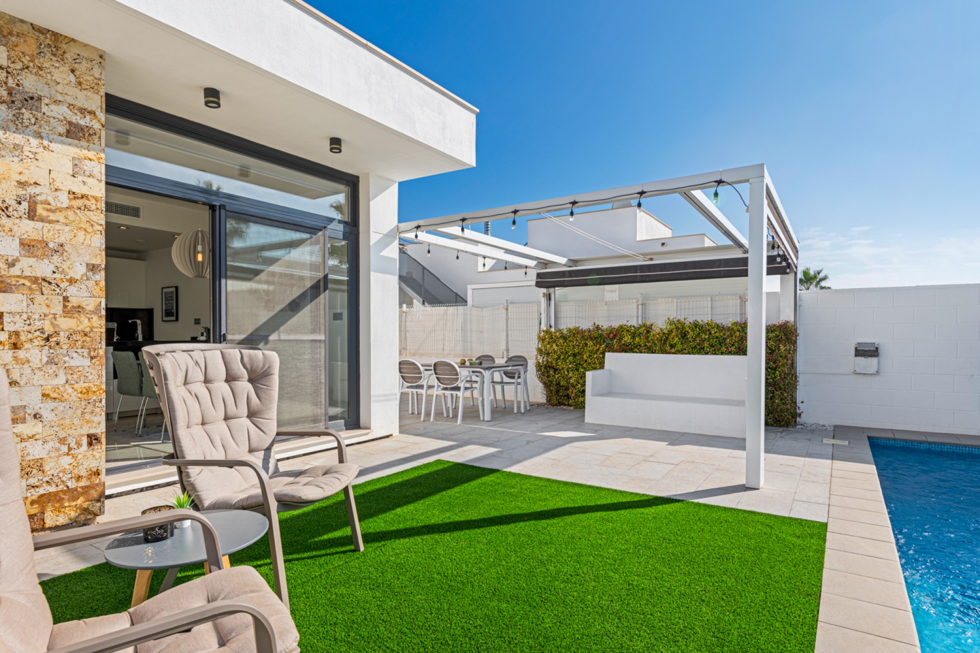 La villa tiene un precioso jardín privado con piscina y mucho espacio para tumbonas y zonas de comedor. También hay instalada una pérgola en el jardín. La propiedad dispone de una plaza de aparcamiento en la parcela.