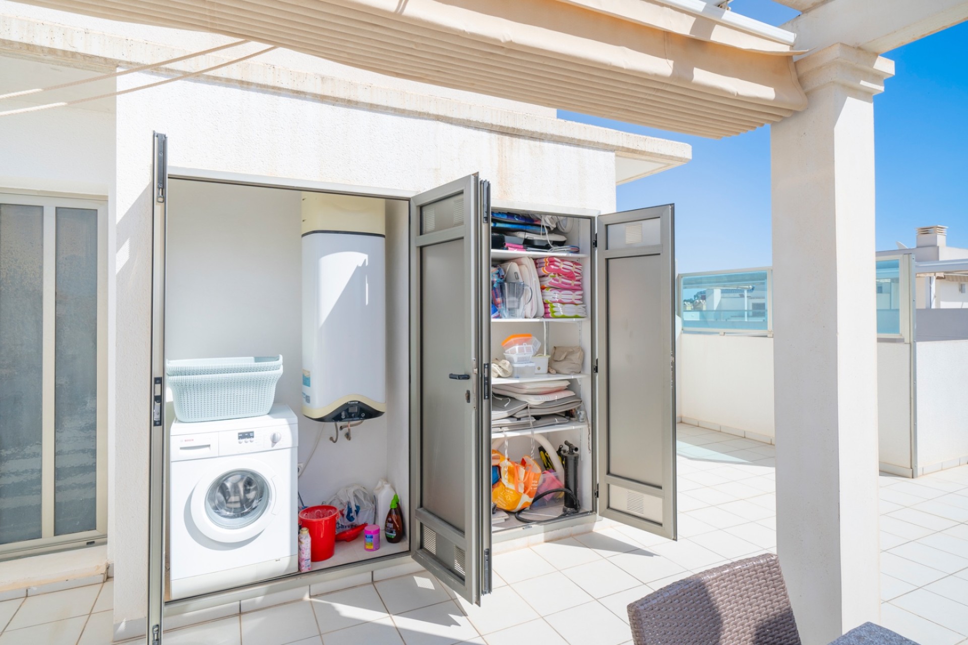 La propiedad consta de un luminoso salón/comedor con cocina abierta, 3 amplios dormitorios y 2 baños (1 ensuite), un balconaje amplio con escaleras que llevan hacia el gran solarium que cuenta con cocina y varios trasteros.