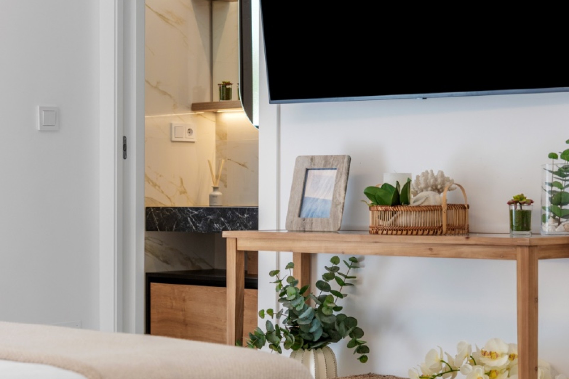 El interior consta de una entrada principal que conduce al salón y al comedor. La cocina de estilo abierto conecta directamente con la terraza exterior. La villa incluye tres dormitorios y dos baños. El dormitorio principal tiene baño en suite, y el segundo baño da servicio a las demás habitaciones. También hay un lavadero independiente con acceso al exterior.
