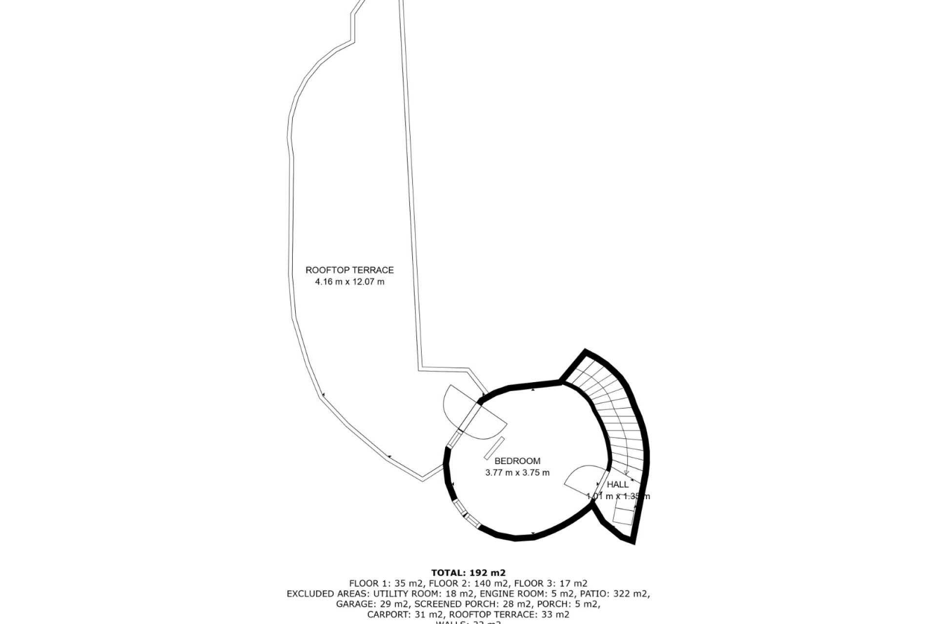 La entrada principal se encuentra en la fachada noroeste. En la planta principal hay un amplio salón-comedor curvo con chimenea, una cocina independiente totalmente equipada, tres dormitorios con armarios empotrados y dos baños. En la planta superior, la torre se utiliza actualmente como oficina y da acceso a una terraza en la azotea con vistas abiertas a las Salinas de Torrevieja.