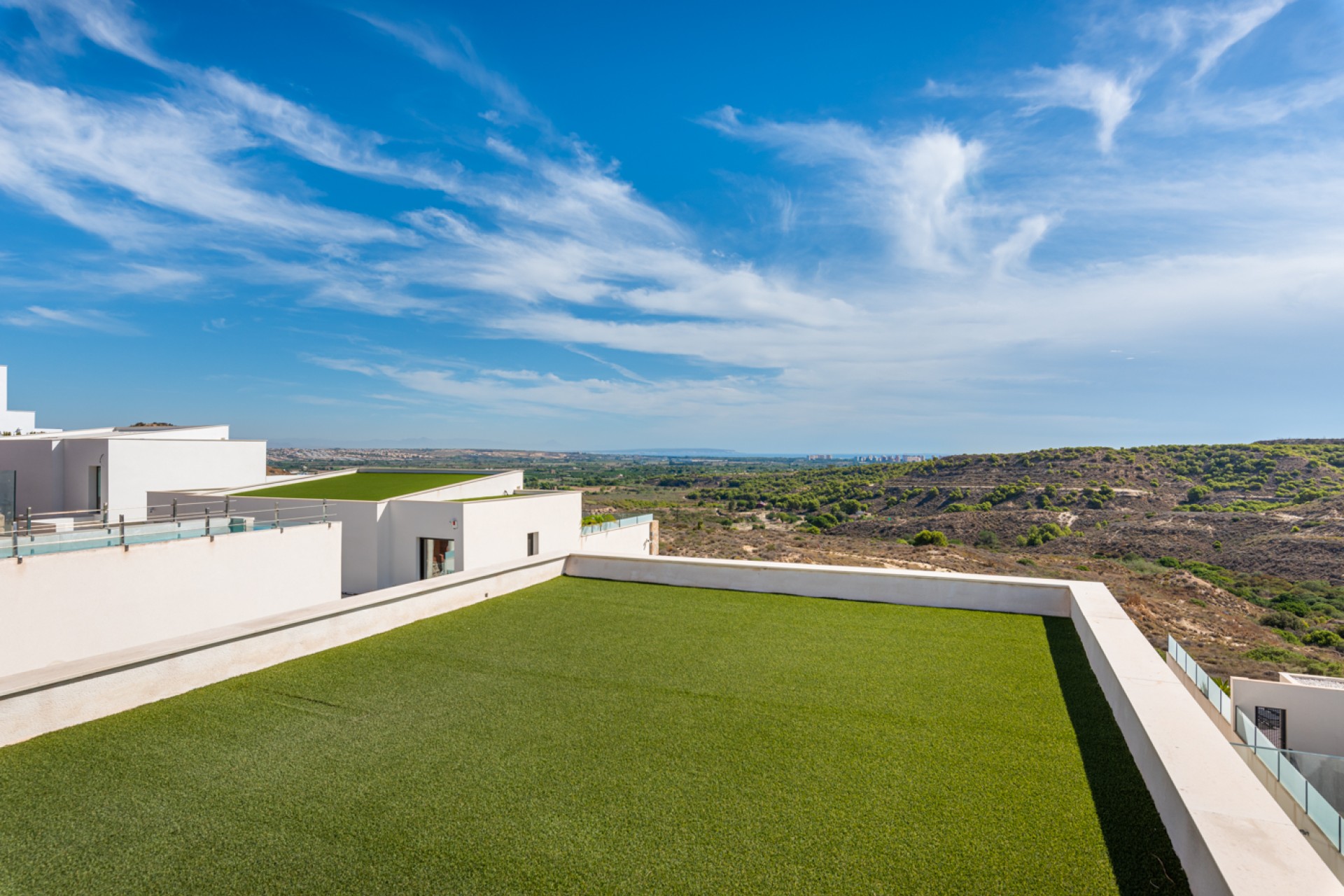De villa is gelegen op een prachtig hoekperceel van 462 m². Het zwembad ligt op het oosten, waardoor u een fantastisch uitzicht heeft over de omgeving en de zee. Rondom het zwembad vindt u een prachtig betegeld terras met ruimte voor diverse zitjes en ligbedden. Vanuit het zwembad is er een buitentrap naar het grote dakterras. Hier is een deel betegeld en een deel voorzien van kunstgras. Beide bieden veel ruimte voor buitenactiviteiten en een fantastisch uitzicht.