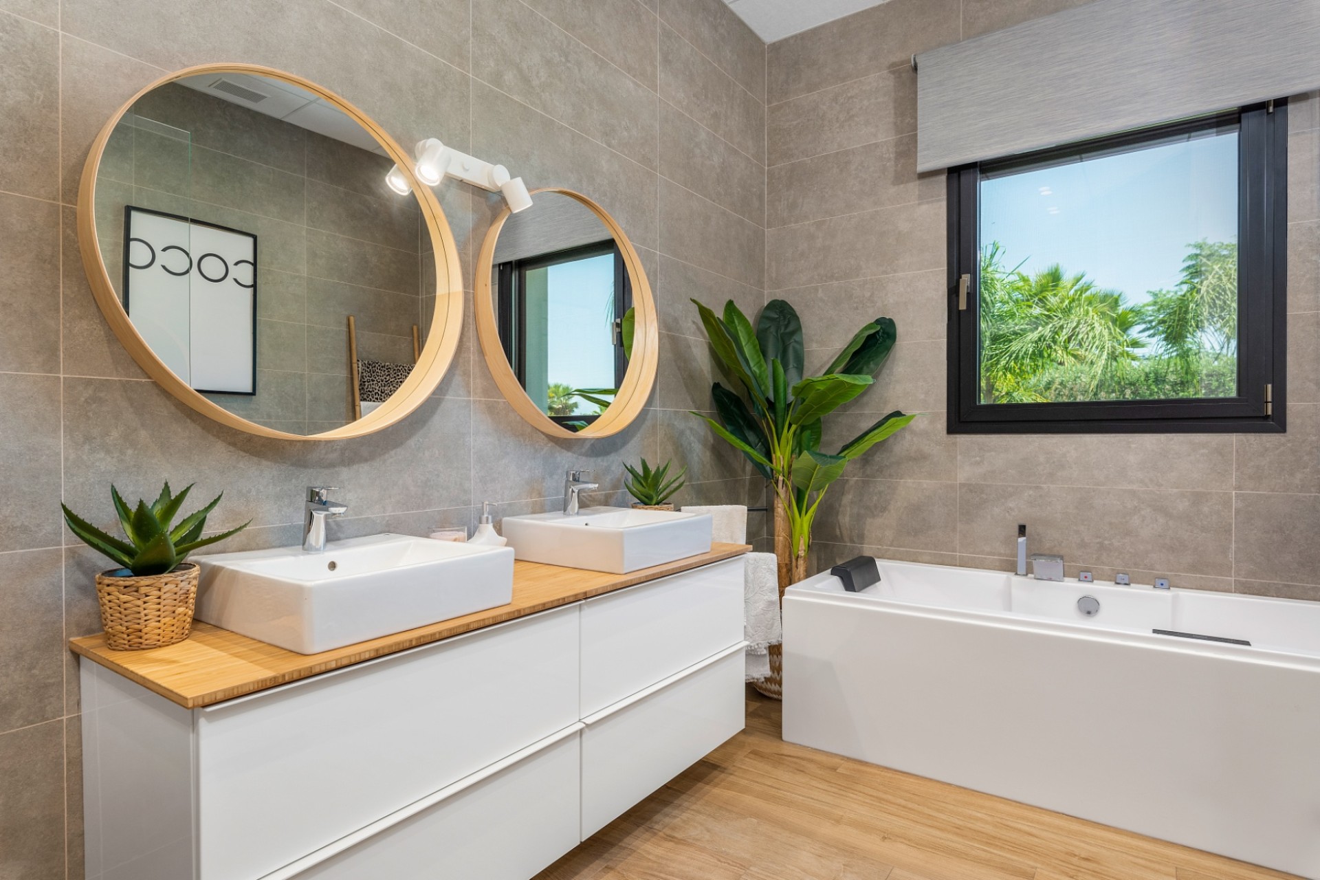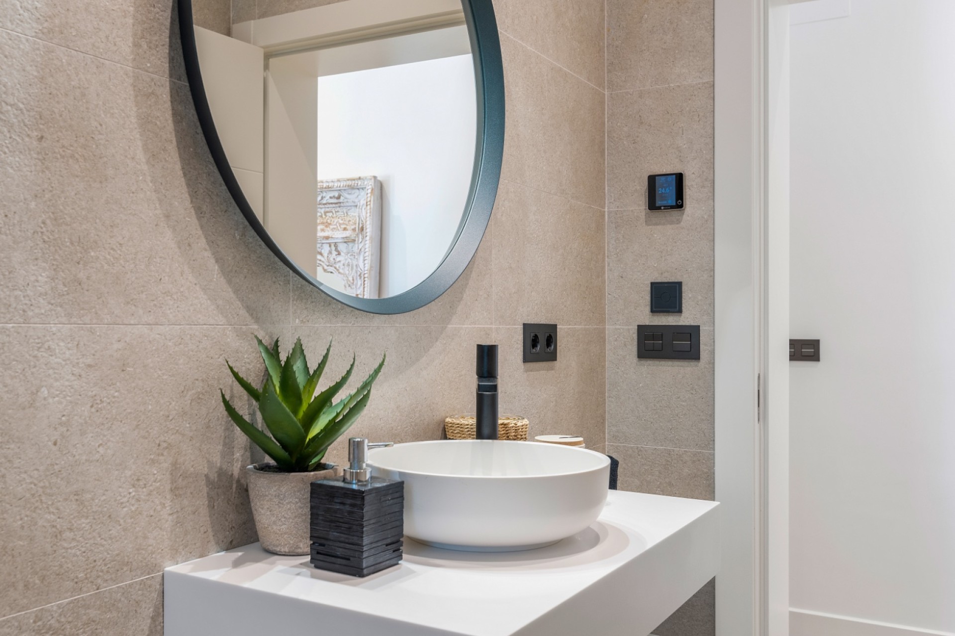 De woning beschikt over 3 complete badkamers met douches, 1 gastentoilet in de woonkamer en 2 badkamers met bubbelbaden. Alle badkamers zijn voorzien van elektronische douches met displays om de watertemperatuur en -druk te regelen, regendouches en onderwatermuzieksystemen met radio en Bluetooth. Alle 3 badkamers hebben vloerverwarming in de douches. De hoofdbadkamer heeft een grote dubbele douche met een zitje.