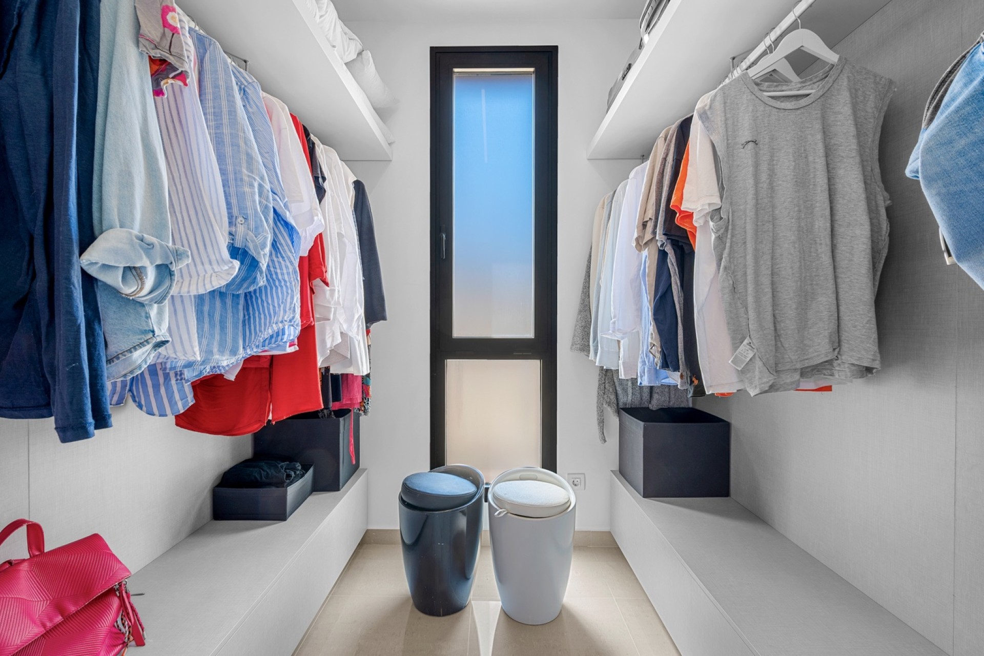 De hoofdingang bevindt zich aan de noordkant, terwijl de tuin en het zwembad op het zuiden zijn georiënteerd. Buiten vormt het privézwembad van 36m² het middelpunt, omringd door een moderne tuin en verschillende zit- en eetruimtes. Een pergola zorgt voor schaduwrijke diners, en het overdekte terras verlengt de leefruimte naar buiten. Op het dakterras bevindt zich een solarium met vrij uitzicht en gedeeltelijk zeezicht.