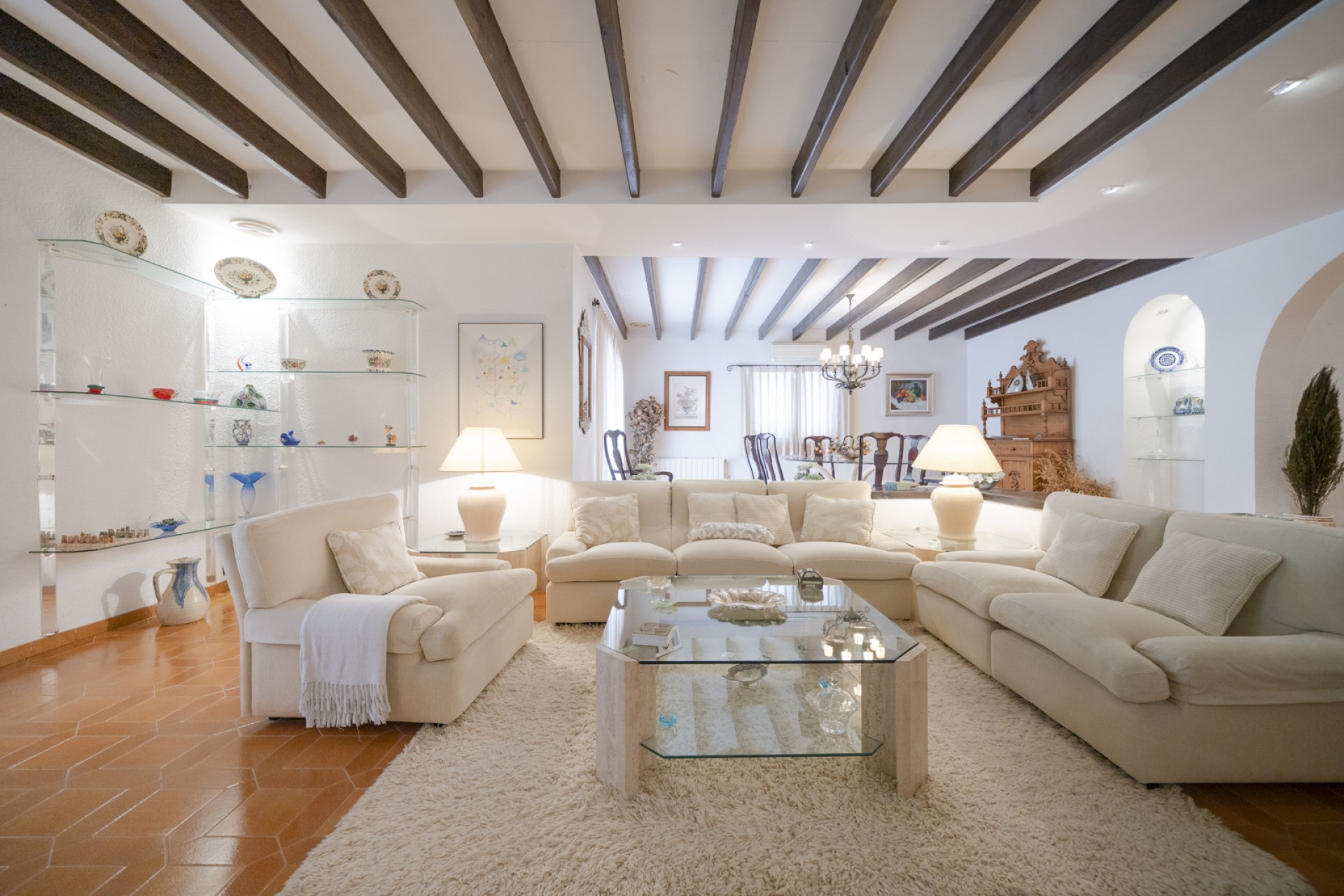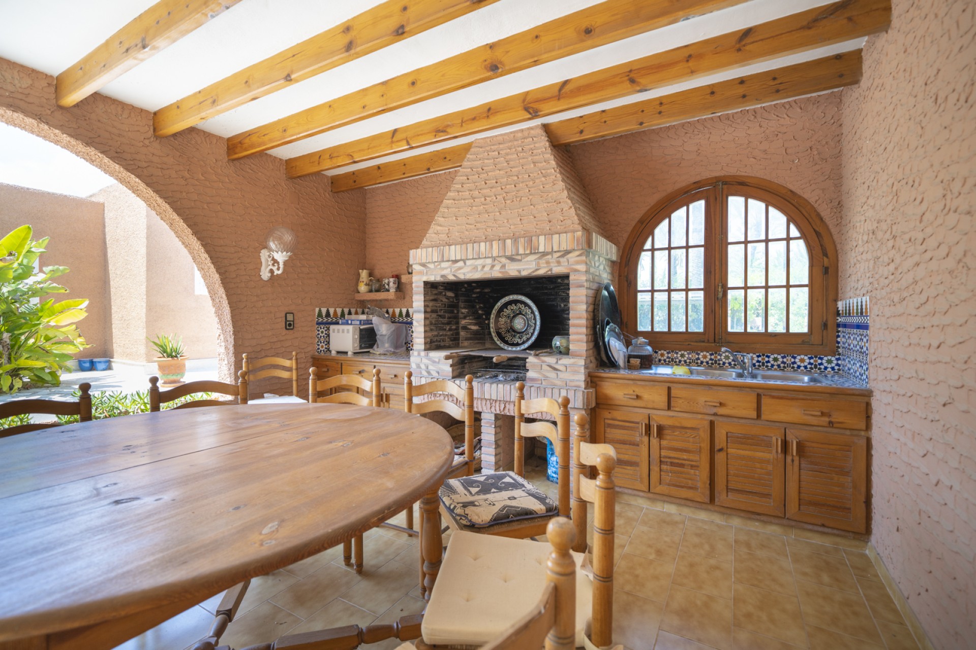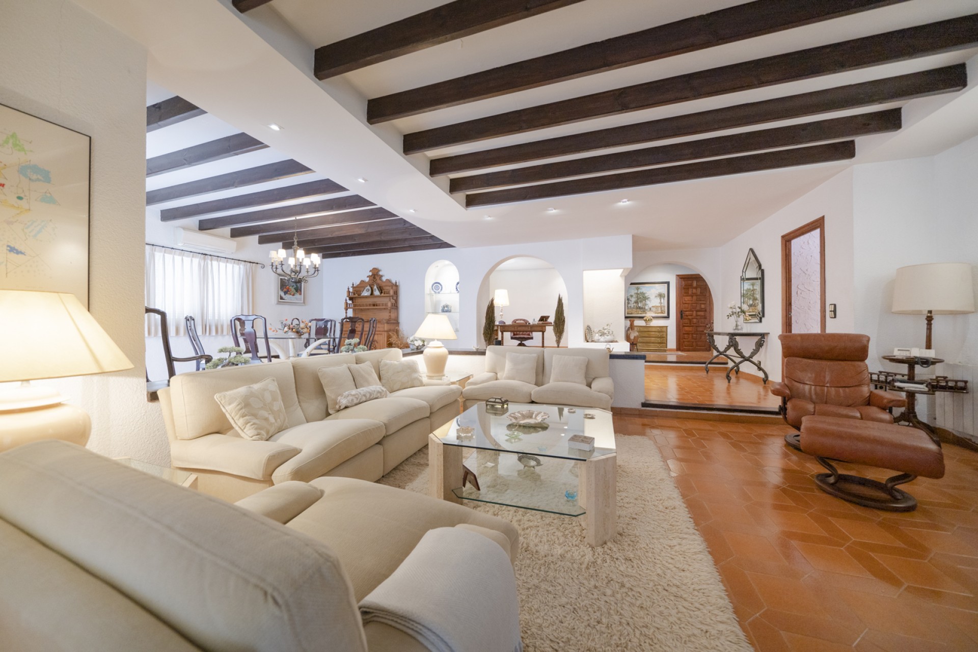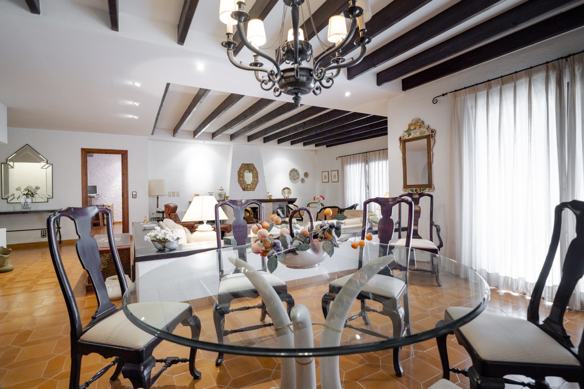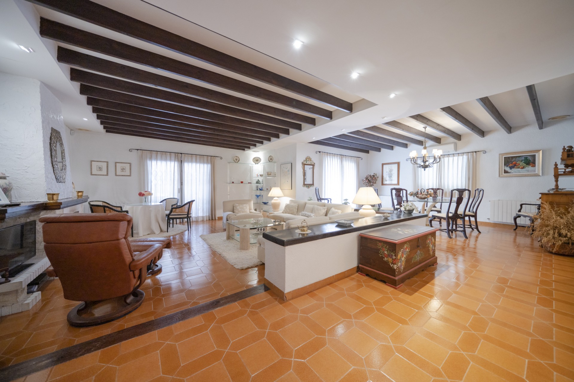 Huset har på utsiden, store overbygde terrasser. Mens interiøret er distribuert, i 2 tydelig distinkte og isolerte områder, kommunisert av brede korridorer på 1,50 m., En første dags sone; der skiller seg ut, 1) en stor kjøkkenbar, amerikansk spisestue med praktisk klassisk peissmiing, 2) edelt område sammensatt av stue med peiskonstruksjon - stor spisestue - samt et elegant kontor, 3) toalett med dusj, 4) Service subzone består av, soverom-soverom-strykejern, pantry og galleri med stor utendørsterrasse. Et annet område om natten; der det er 4 store soverom og 3 bad med ventilasjon og naturlig belysning.
