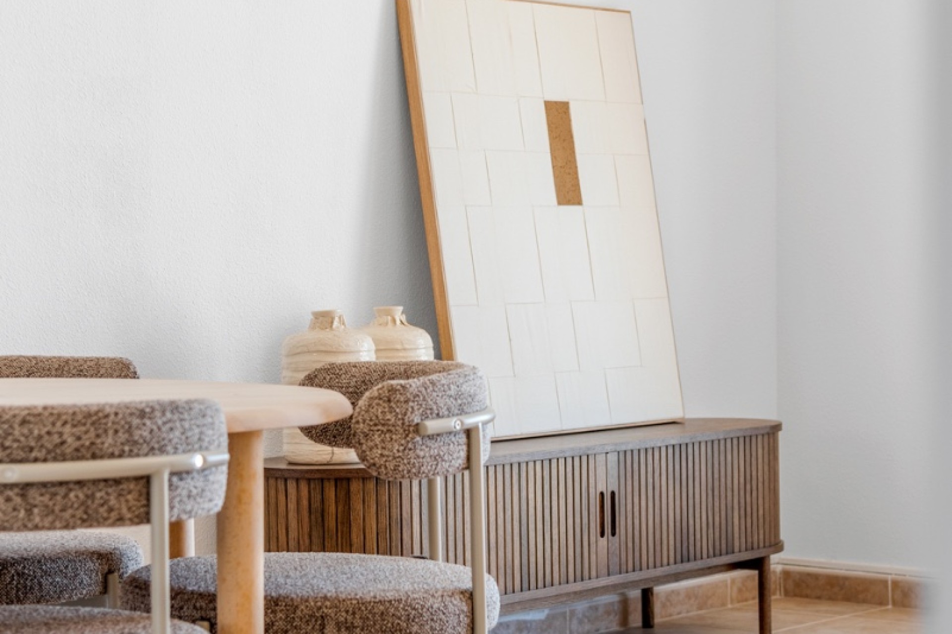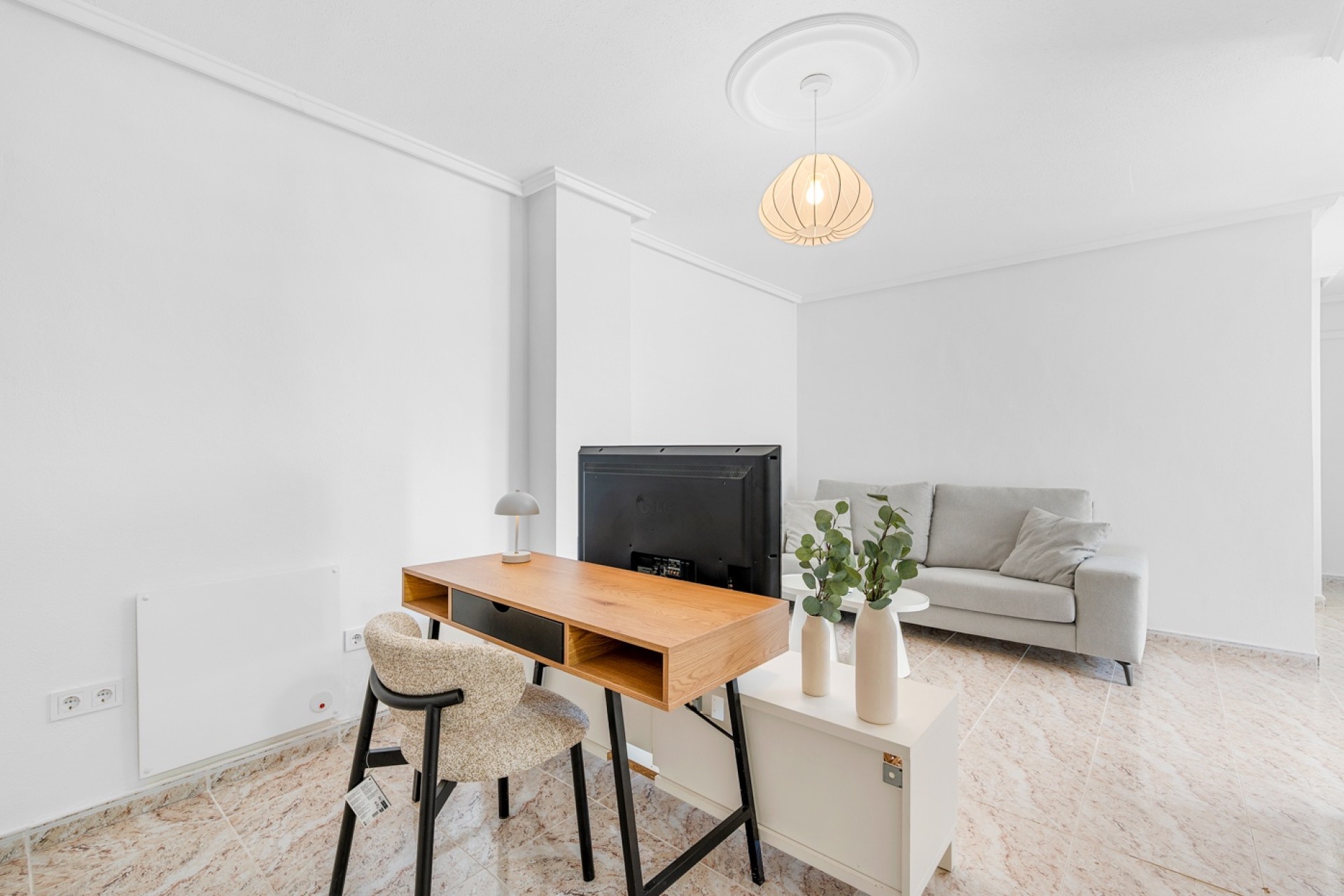 Bygget i 2006 ligger eiendommen på en tomt på 137 m² og har 105 m² boareal fordelt på tre nivåer. Hovedetasjen ønsker deg velkommen med et nylig renovert, fullt utstyrt kjøkken som åpner seg mot spise- og stueområdet i en lys og åpen planløsning. Denne etasjen inkluderer også et gjestetoalett og to utendørsområder: en sørvestvendt balkong med fri utsikt mot La Marquesa golfbane og grøntområdene, samt en sjarmerende uteplass mot den rolige gaten – perfekt for sitteplasser eller uformelle måltider utendørs.