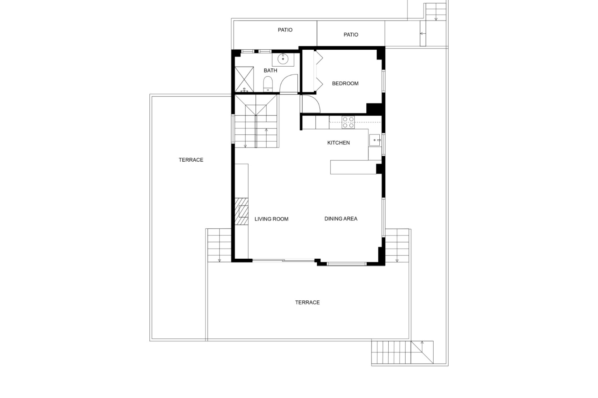 Hovedetasjen har et separat fullt utstyrt kjøkken, en lys stue/spisestue med peis, et soverom med innebygd garderobe og et komplett bad. Fra stuen er det utgang til en romslig terrasse med havutsikt, samt flere uteplasser for avslapning eller sosiale sammenkomster.