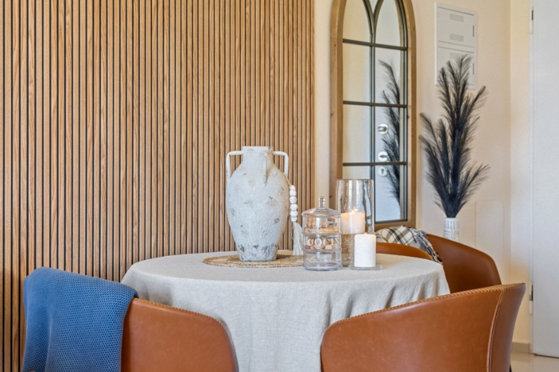 Nowoczesne wnętrze z dekoracyjnymi ścianami z drewnianych listew i eleganckimi wykończeniami