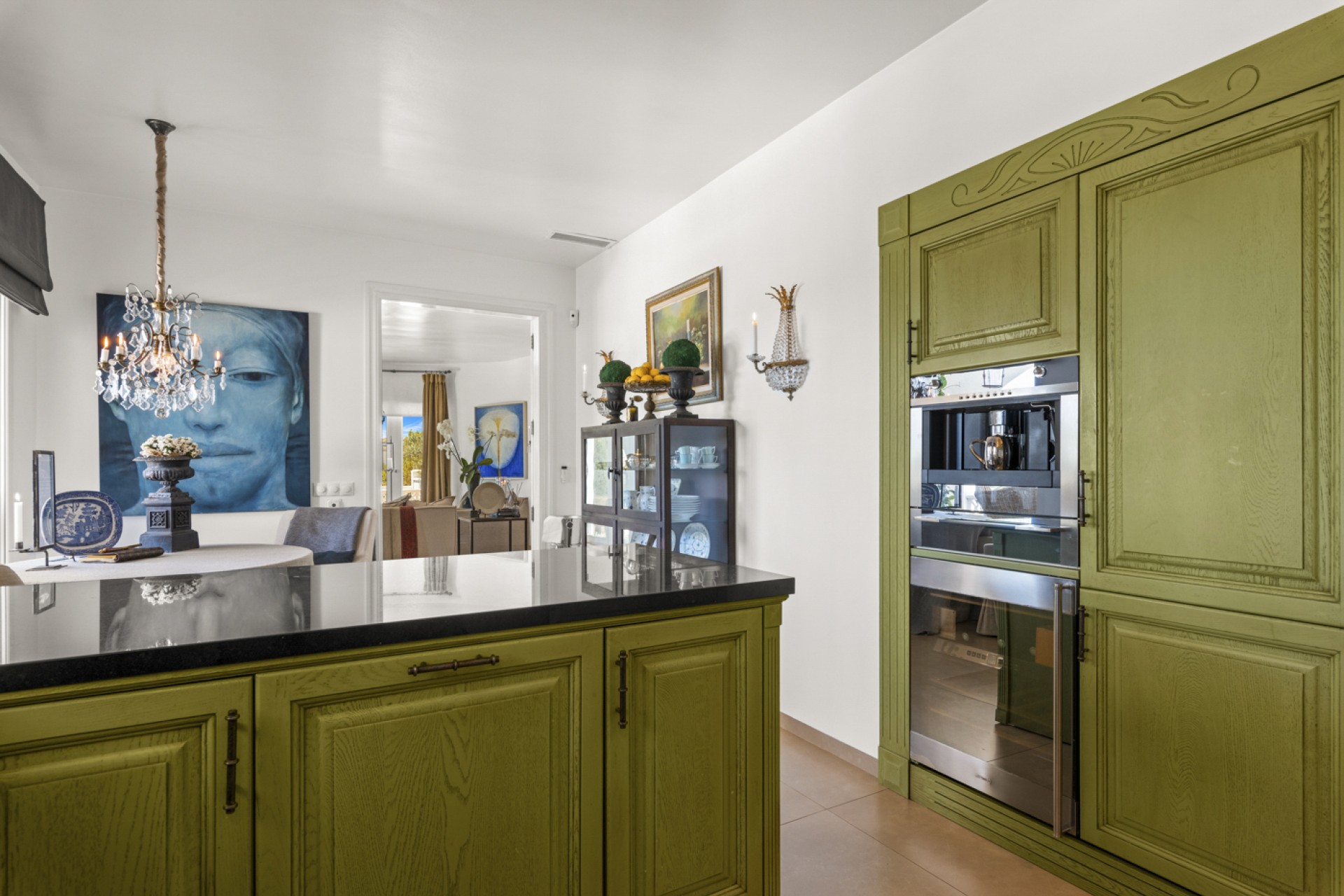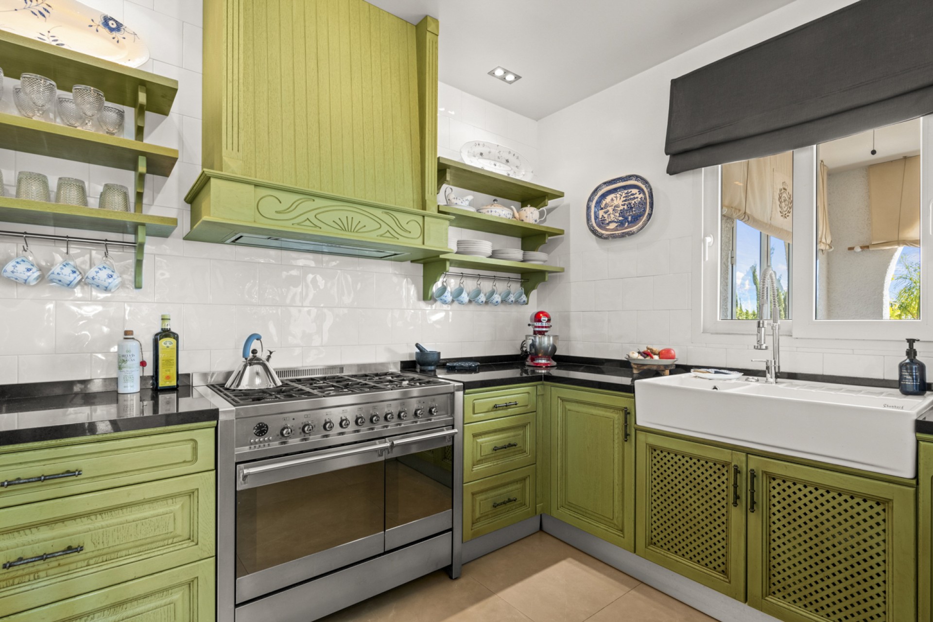 Na parterze znajduje się salon z oknami sięgającymi od podłogi do sufitu, zapewniającymi doskonałe naturalne światło i piękny widok na zagospodarowany ogród. Zawiera przytulny marmurowy kominek gazowy zapewniający ciepło i atmosferę w chłodne wieczory oraz zintegrowane półki. Jadalnia wychodzi na duży taras i można ją łatwo przekształcić w sypialnię. Kuchnia wyposażona jest w zintegrowany ekspres do kawy, podgrzewacz płytowy, lodówko-zamrażarkę, zmywarkę, okap z wentylacją mechaniczną, kuchenkę gazową stalową z dwoma piekarnikami, blaty granitowe oraz podgrzewaną podłogę. W pralni znajduje się pralka i suszarka. W łazience na podłodze i ścianach znajdują się marmurowe płytki, oprawy typu downlight, wbudowana wanna z prysznicem, toaleta i podgrzewana podłoga. Znajduje się w nim także sypialnia z zabudowaną szafą.