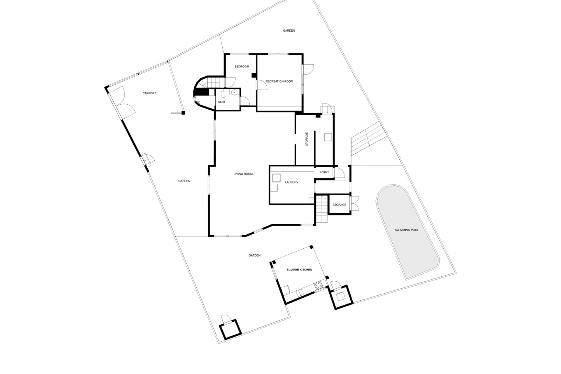 Poziom dolny ma dostęp zarówno przez wewnętrzną klatkę schodową, jak i bezpośrednio z ogrodu. Znajduje się tu salon, sypialnia i łazienka.