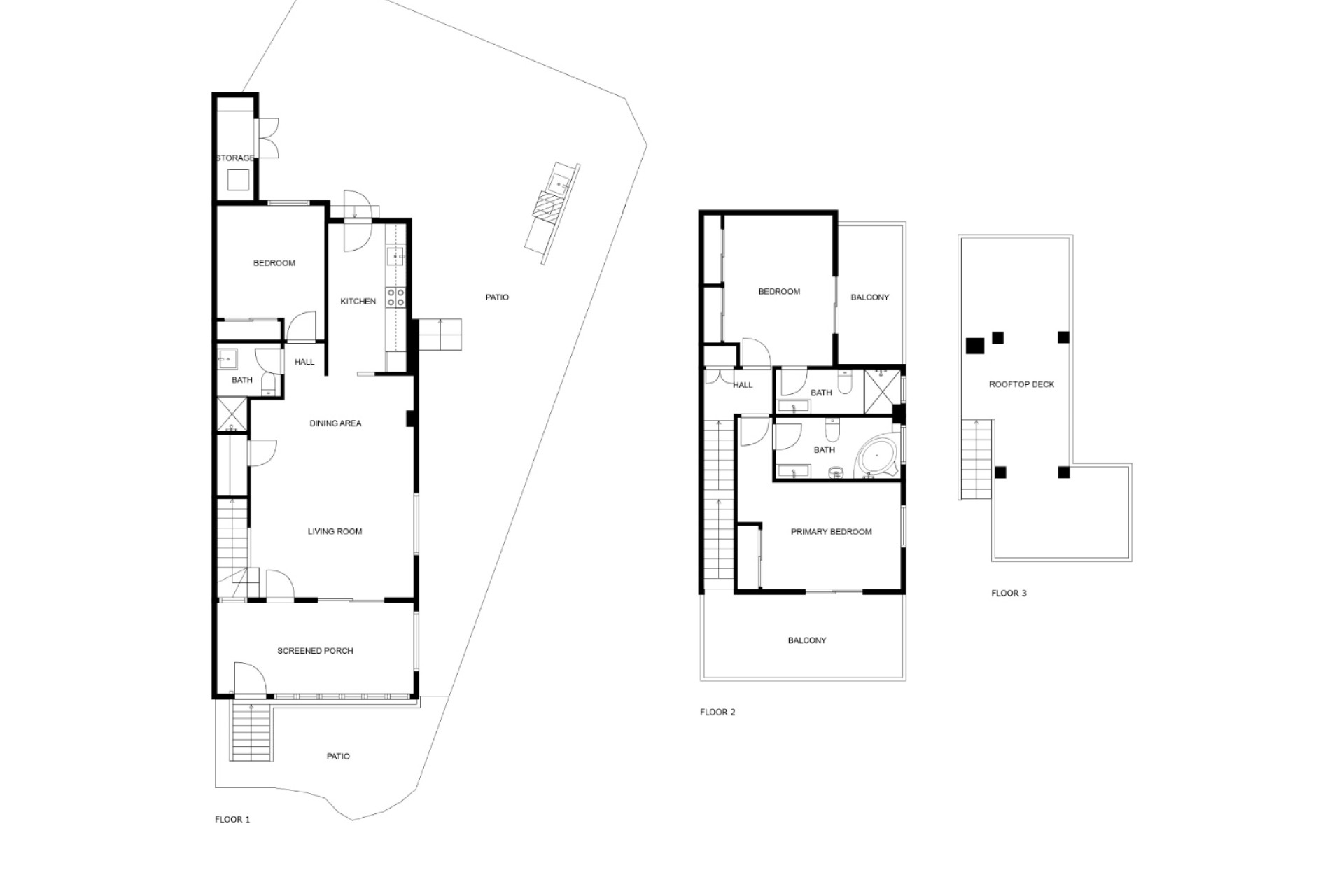 Na pierwszym piętrze znajdują się dwie sypialnie dwuosobowe, obie z prywatnymi łazienkami (en suite). Każda z sypialni ma wyjście na prywatny taras, przy czym jeden z nich prowadzi również na taras na dachu.
