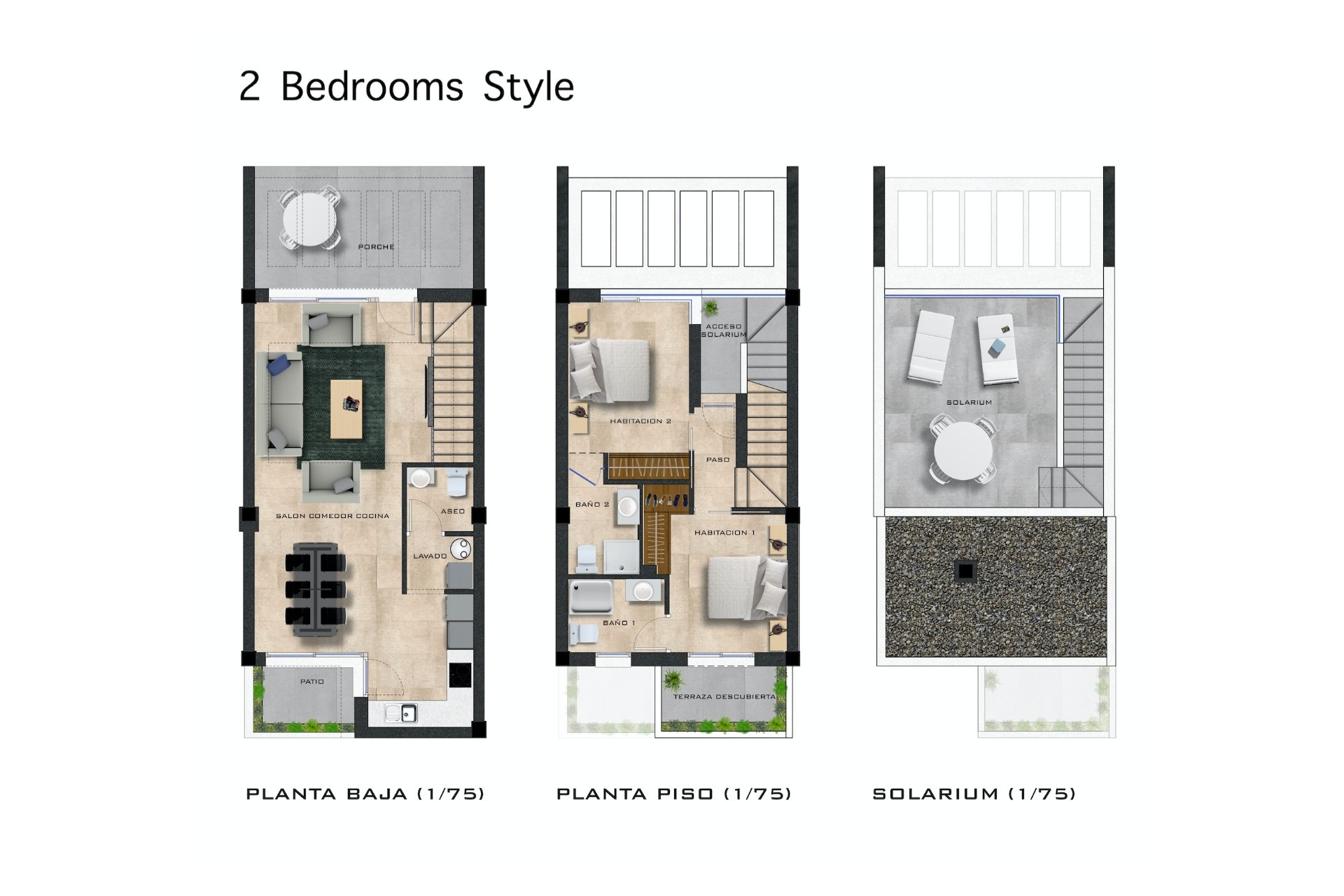 All townhouses have a private terrace and patio on the ground floor, as well as a terrace on the first floor. All houses have a private roof terrace of 17,7 sqm. The townhouses are part of a lovely community with communal areas and a swimming pool.