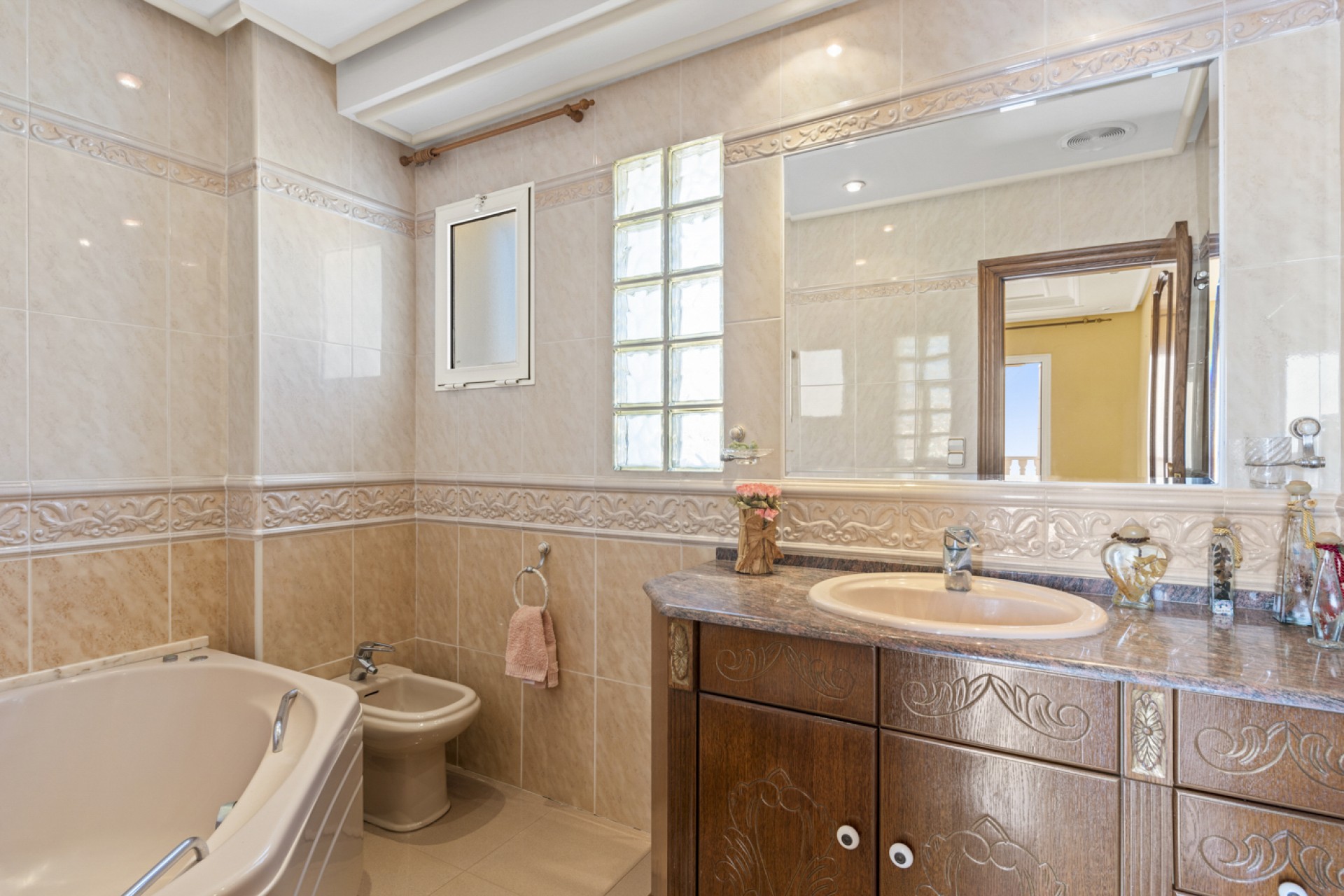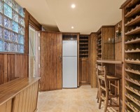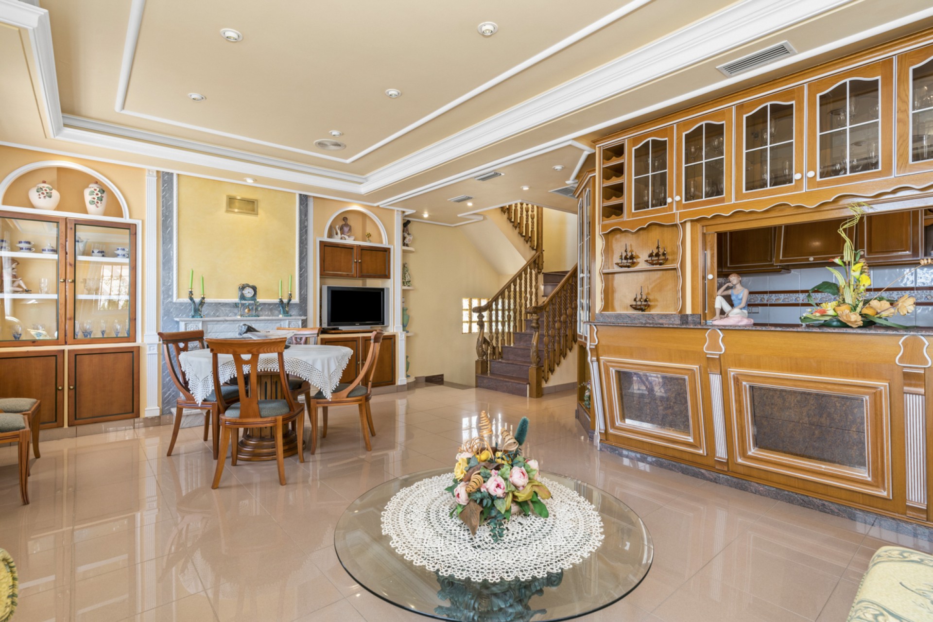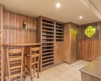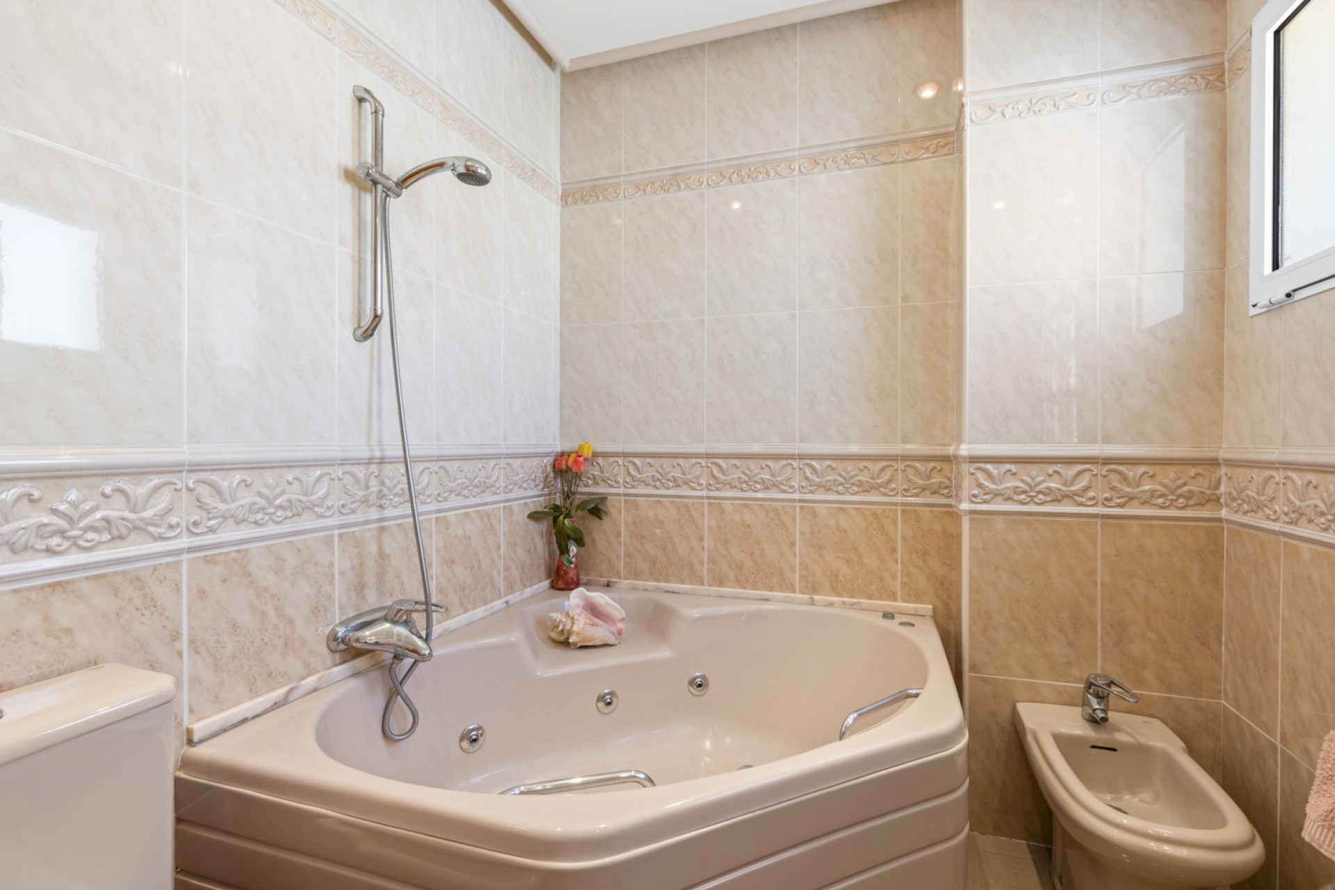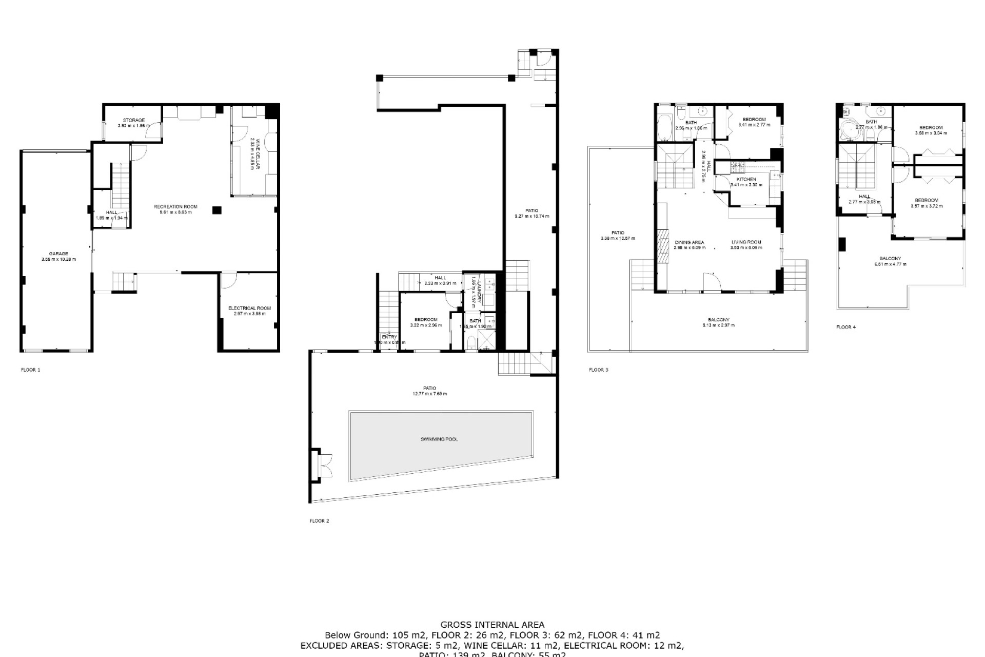 The house is set one 4 floors and has a total living area of 117,35 m2. On the bottom floor we can find a recreation room, a spacious garage, a wine cellar and a utility room. On the first floor there is a side patio and a wonderful front patio with a pool and sea views. We can also find a laundry room, a bedroom and a bathroom. On the main floor, we find a dining/living area with access to a 27sqm balcony with sea views. Also, there is a kitchen, a bathroom and a room with built-in wardrobes. On the top floor there are two rooms, a bathroom that features a massage bathtub and a balcony, accesible from one of the rooms.