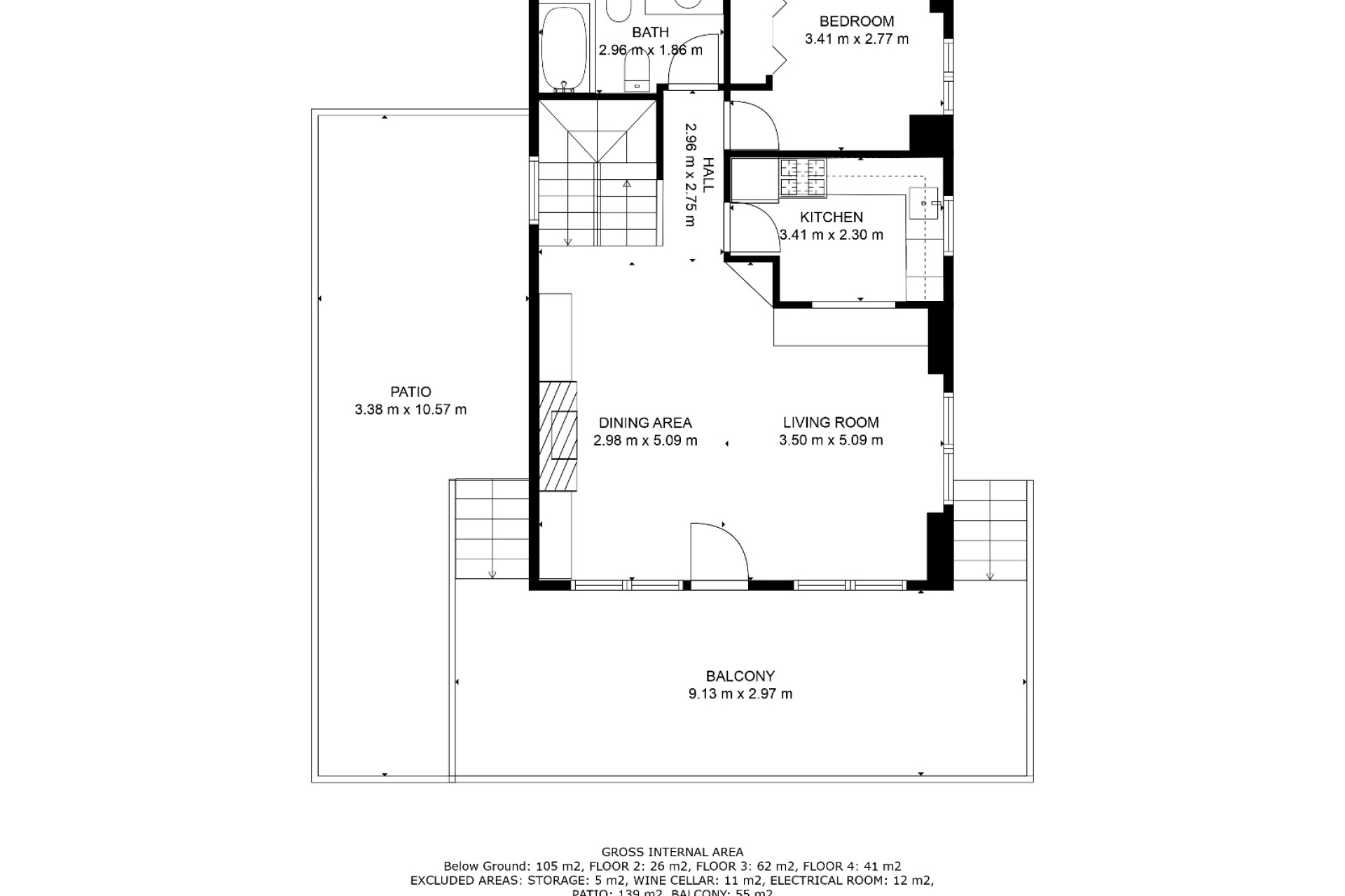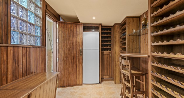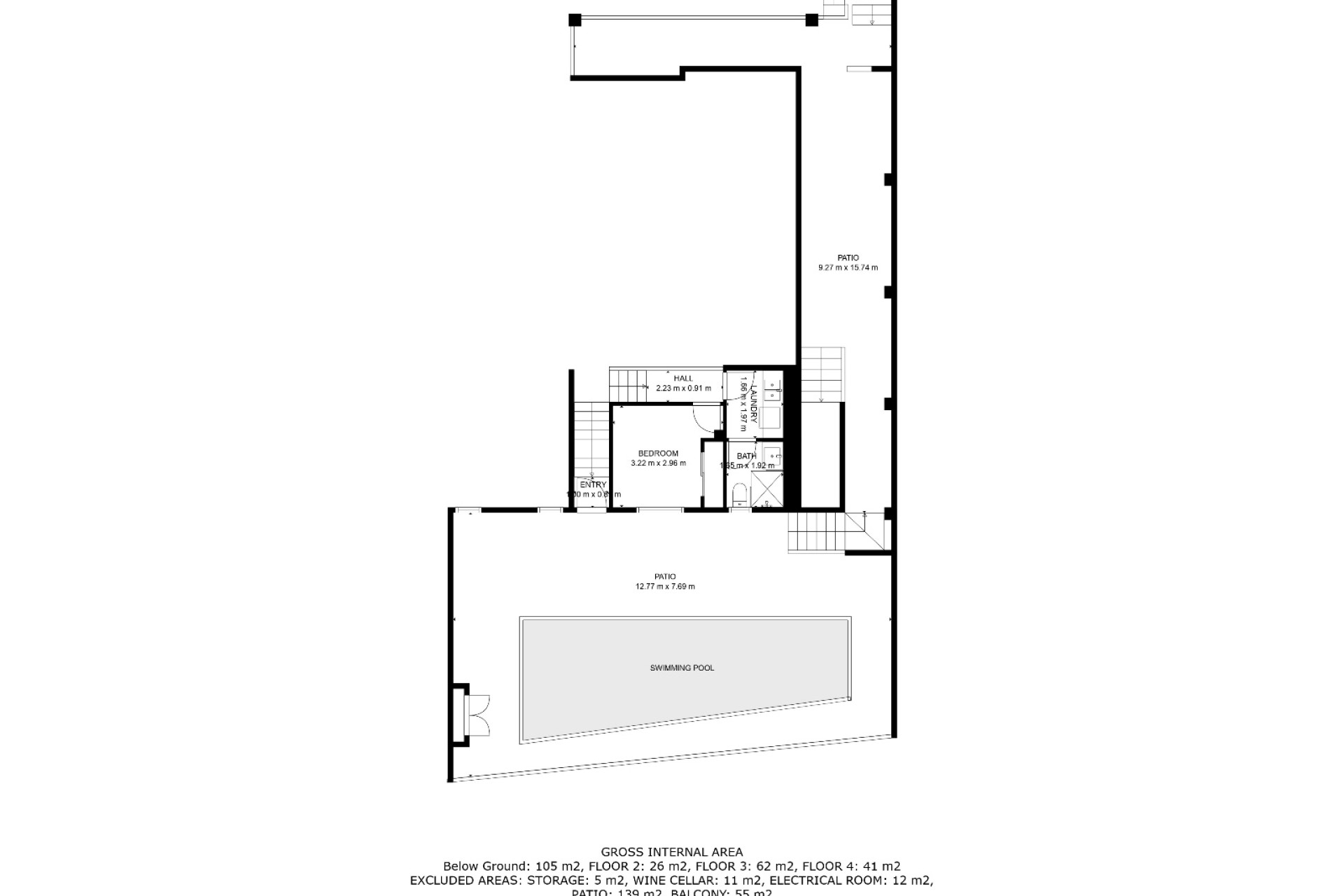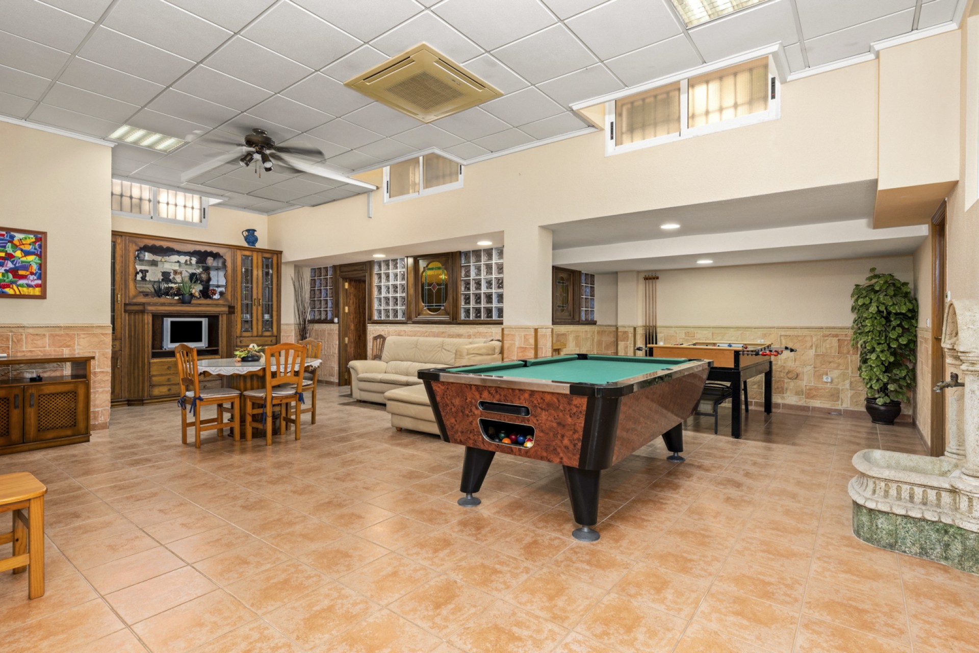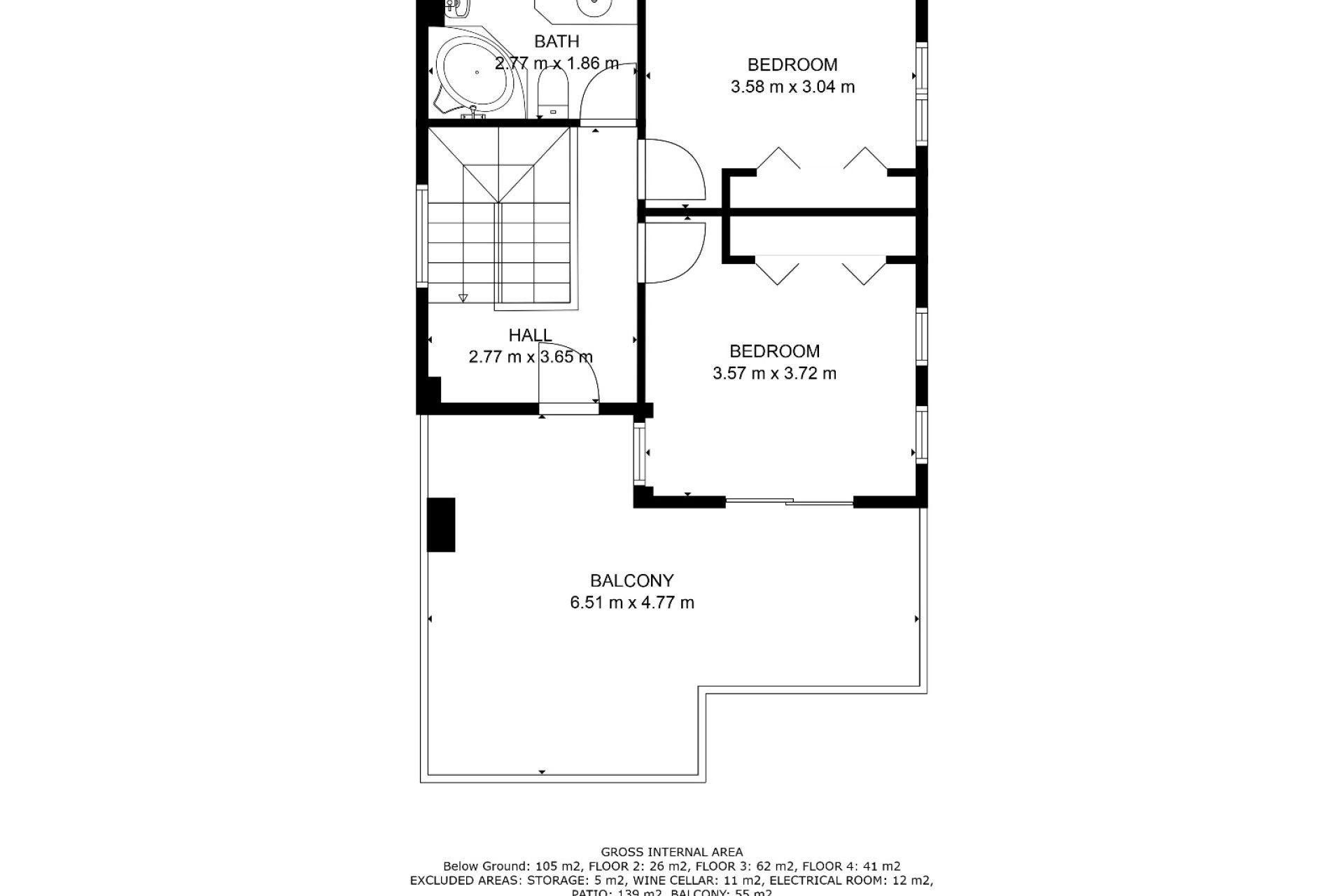 The house is set one 4 floors and has a total living area of 117,35 m2. On the bottom floor we can find a recreation room, a spacious garage, a wine cellar and a utility room. On the first floor there is a side patio and a wonderful front patio with a pool and sea views. We can also find a laundry room, a bedroom and a bathroom. On the main floor, we find a dining/living area with access to a 27sqm balcony with sea views. Also, there is a kitchen, a bathroom and a room with built-in wardrobes. On the top floor there are two rooms, a bathroom that features a massage bathtub and a balcony, accesible from one of the rooms.