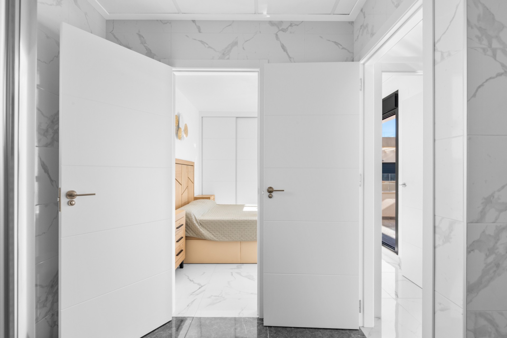The top level consists of two double bedrooms, a bathroom and a spacius terrace with access to it from the hall in this level and from one of the bedrooms. This terrace leads to the roof terrace / solarium with spectacular views to the salt lakes.