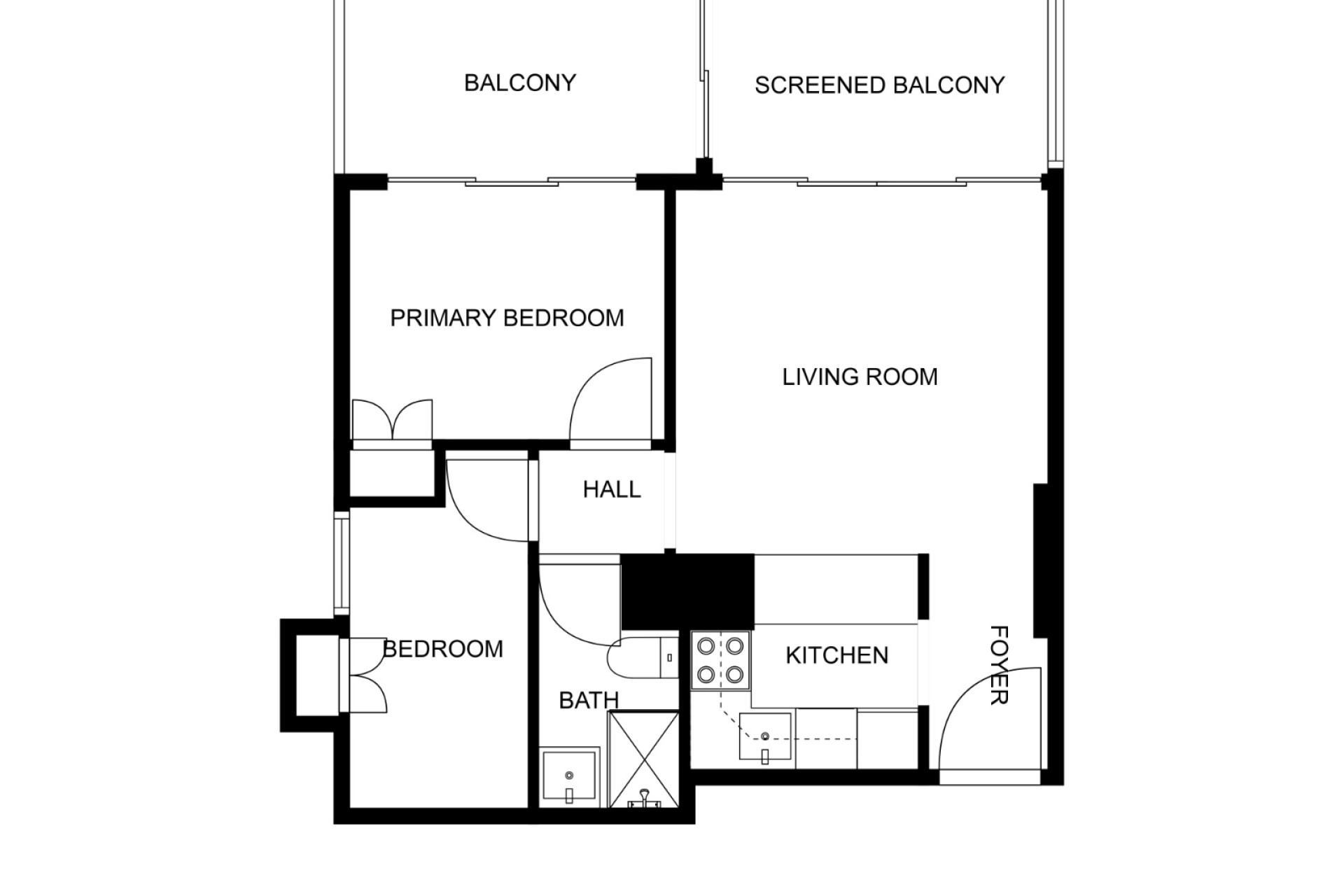 You will find a living room with an open kitchen, two bedrooms, one bathroom and a spacious terrace (half glazed and half open).