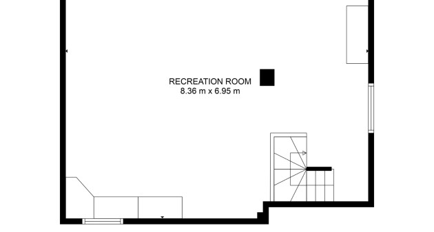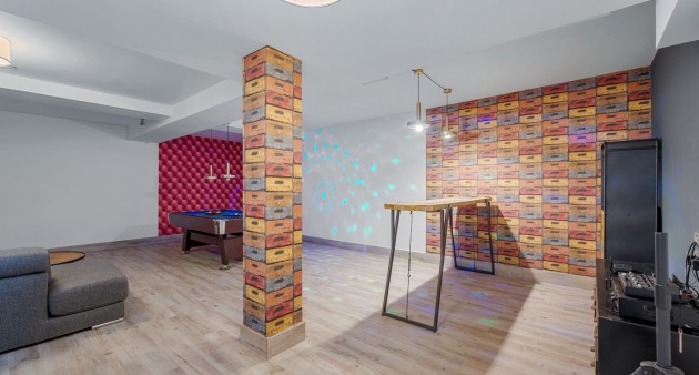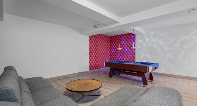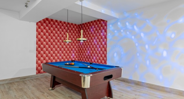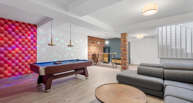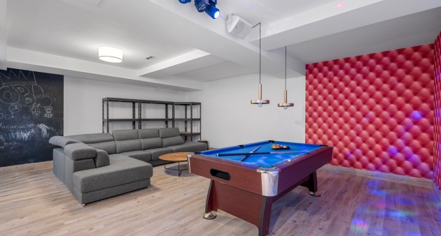 The basement is currently used as a recreational space with a billiard area and provides additional room for various uses.