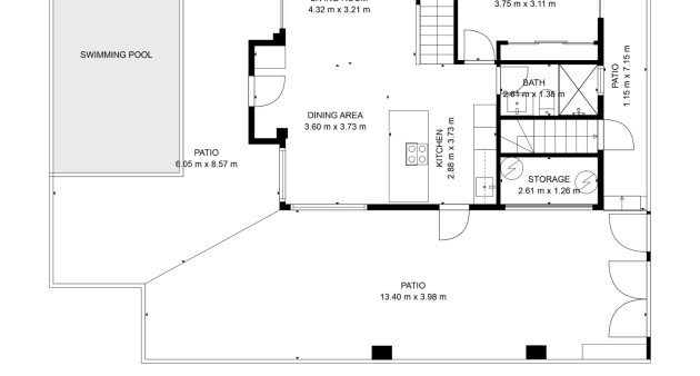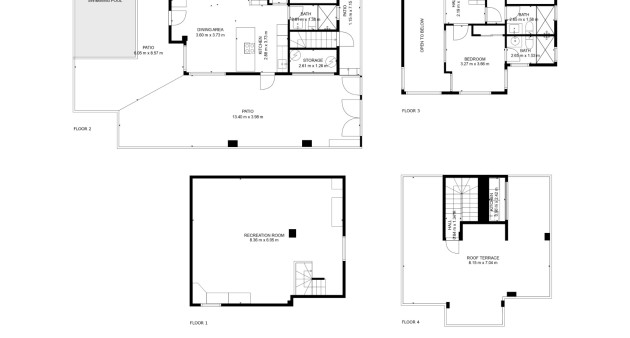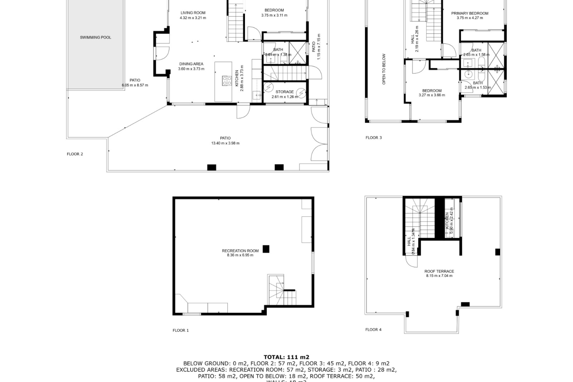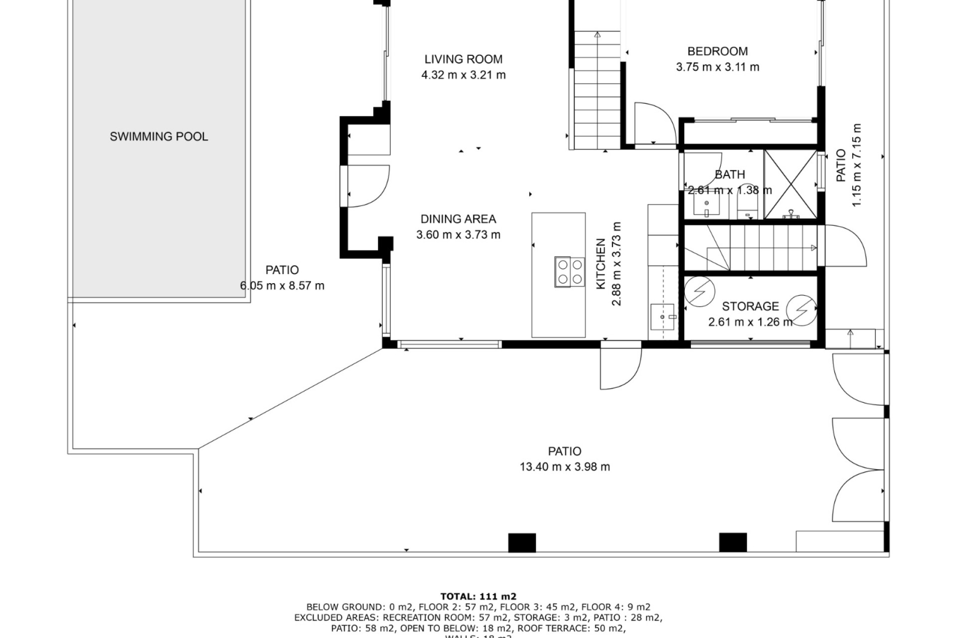 The main floor features a living room, dining area, and an open-plan kitchen with a central island. This level also includes one bedroom with a built-in wardrobe, a full bathroom, laundry area, and direct access to the garden and private pool.