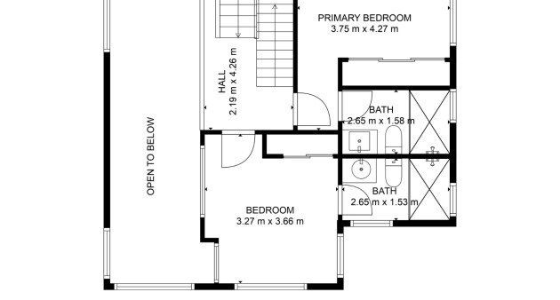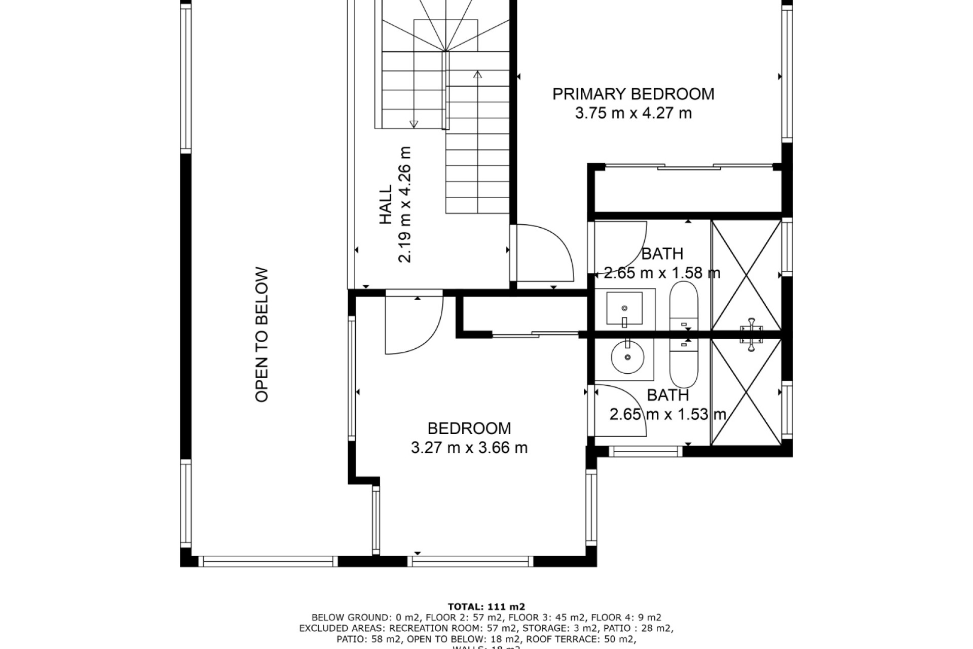 Upstairs, there are two additional bedrooms. The main bedroom has an en-suite bathroom and access to a private terrace. The second bedroom is next to another full bathroom. A hall connects both rooms.