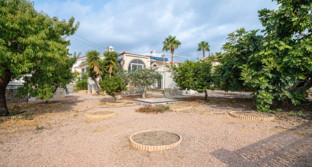Detached villa built in 1983 with a living area of 92 m², set on a generous plot of 900 m². The property offers two bedrooms and one bathroom, a living room with fireplace, an independent kitchen, and a glazed terrace facing south, which leads via stairs down to the pool area. From the north façade, there is an entrance to a hallway that connects directly to the kitchen.