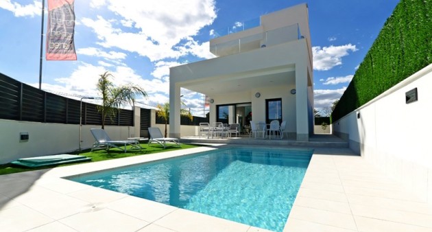 These modern villas are now for sale in La Marina, ony 350 meters from the beach. The villas all extend over two floors and have a living area of between 112 sqm. and 124 sqm. Some of the villas can also be built with a large basement with a storage room under the stairs. The ground floor consists of a double bedroom with a fitted wardrobe, a bathroom, a laundry, and a living/dining room with an open-plan kitchen. The first floor consists of two double bedrooms, both of them with en-suite bathrooms, and one of them with a fitted wardrobe and one of them with a dressing room.